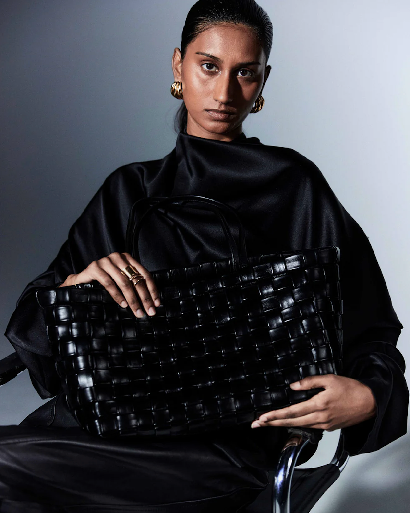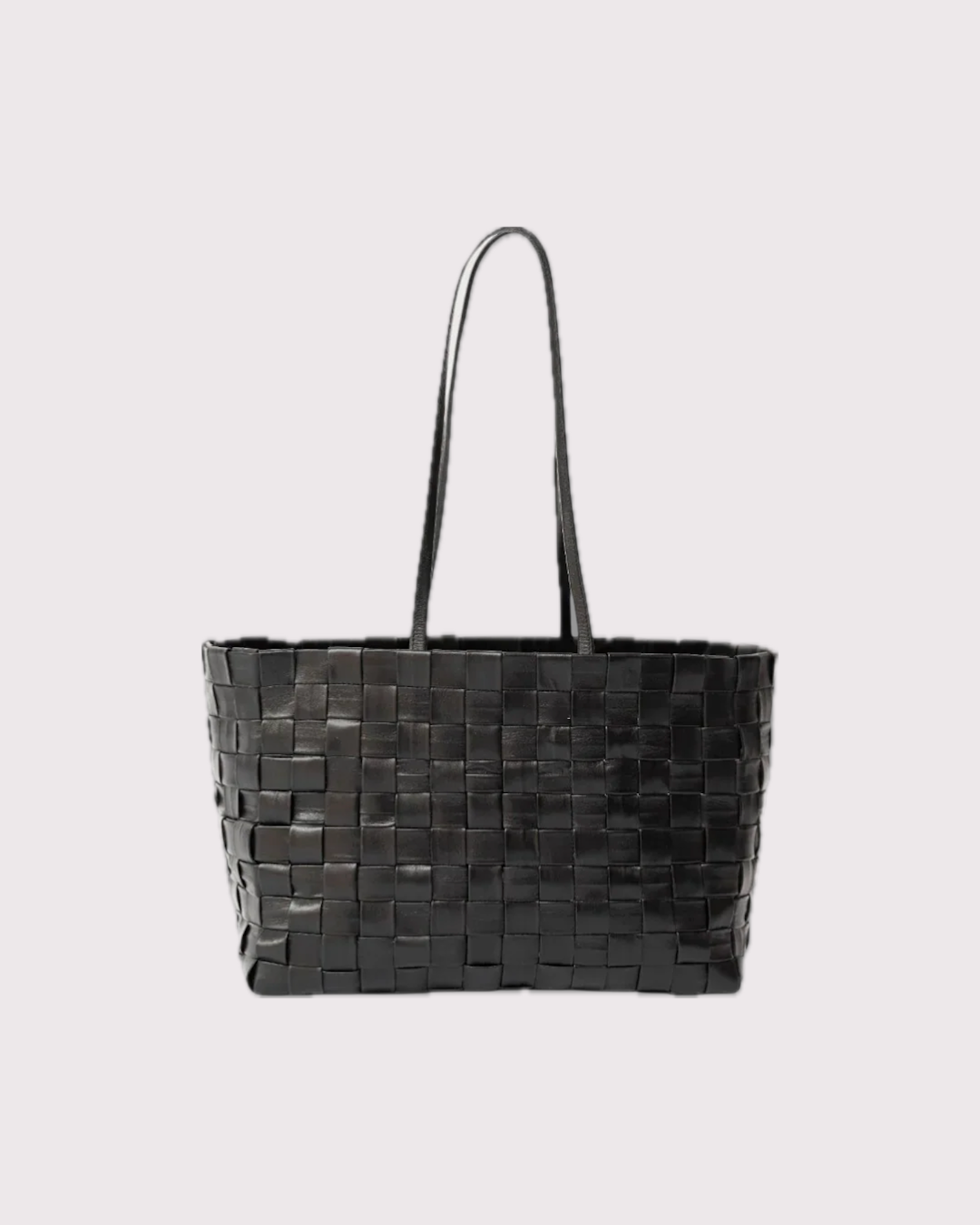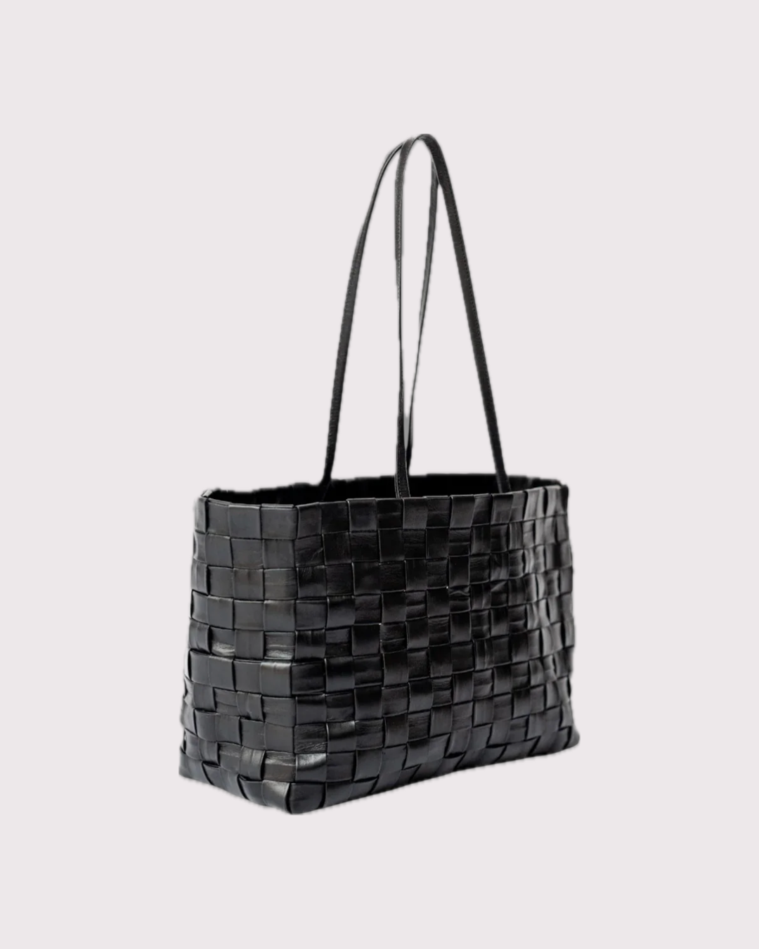 - Handwoven box weave shopper with shoulder straps featuring spacious interior.