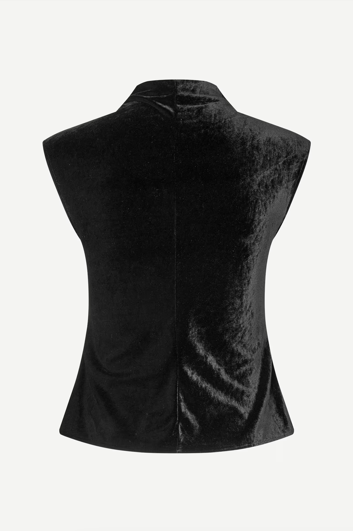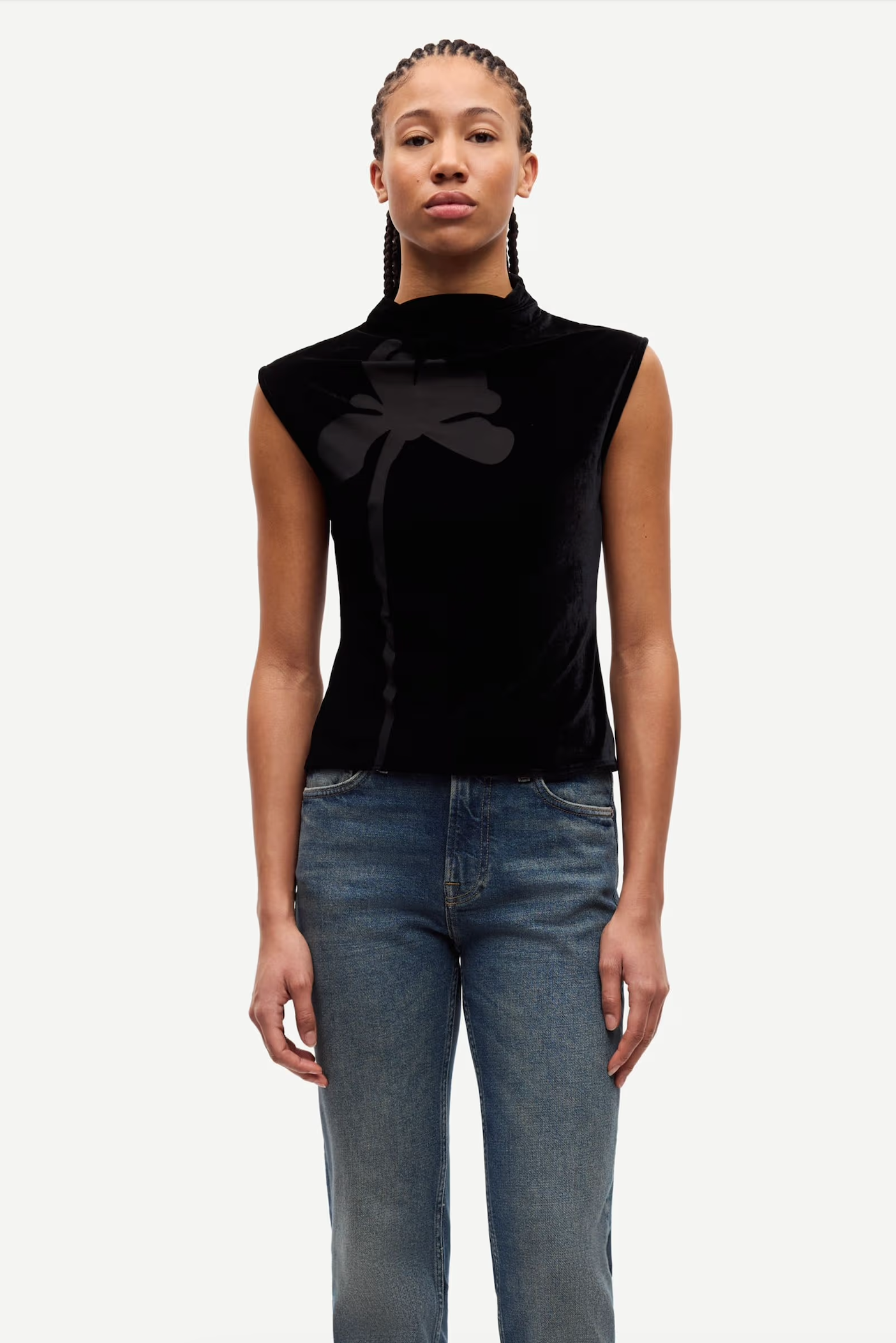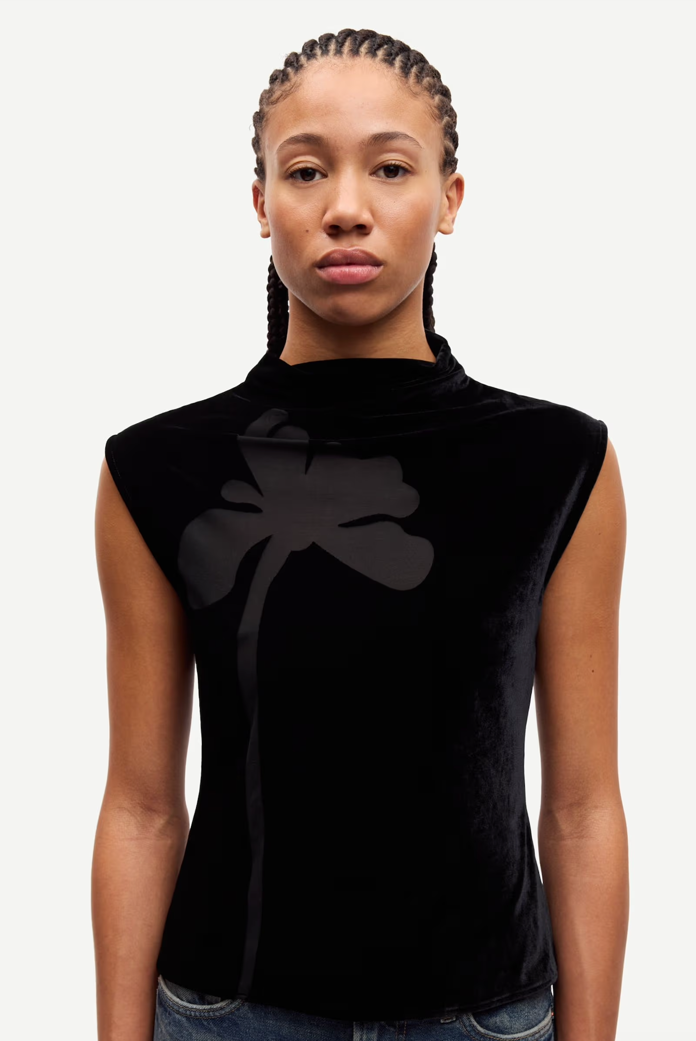 SAMSØE SAMSØE Sakalani Top - Black. Velvet top with a slim fit and sheer floral detailing. High neck. Main material made from an elastic recycled polyester blend.