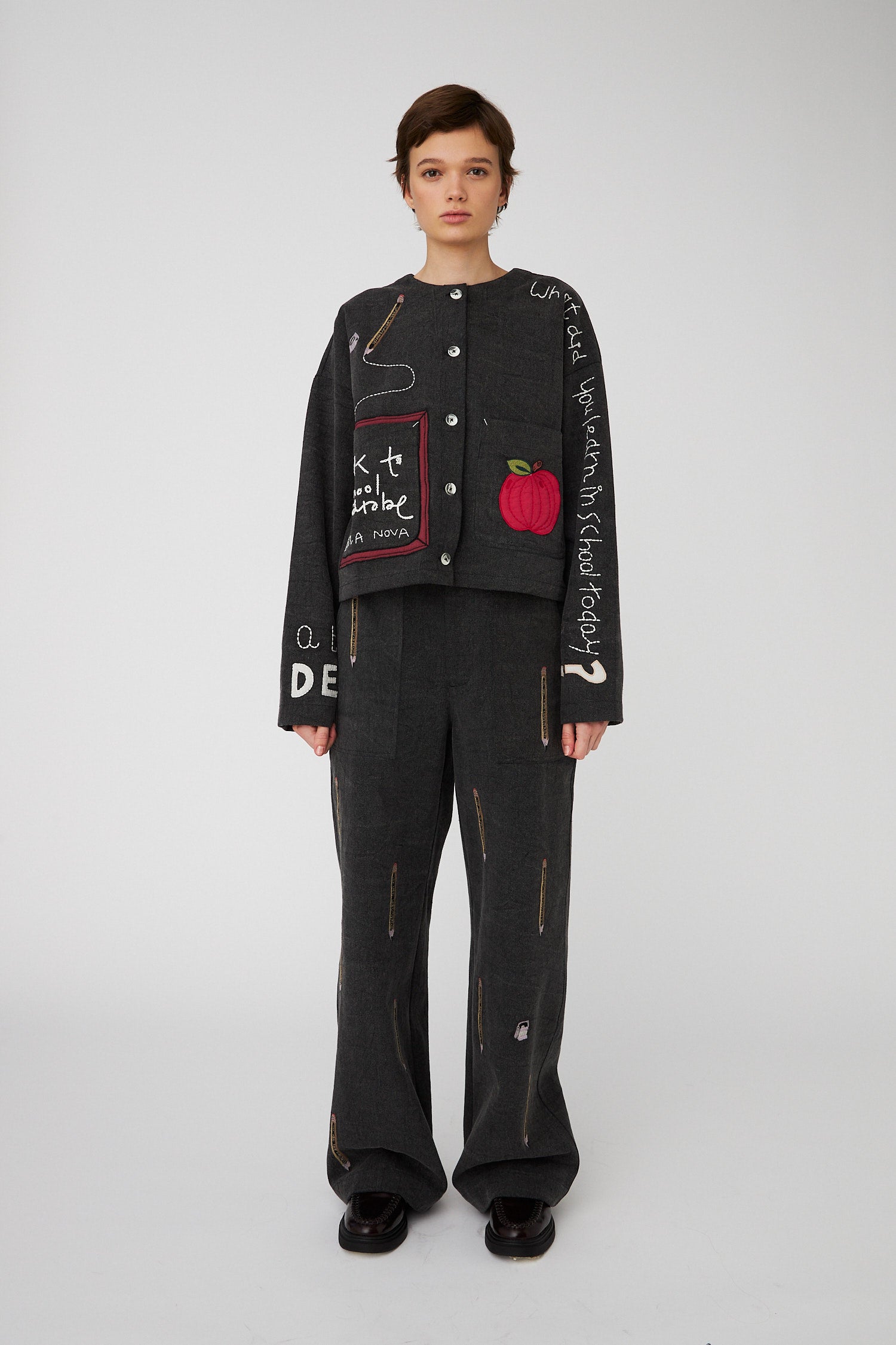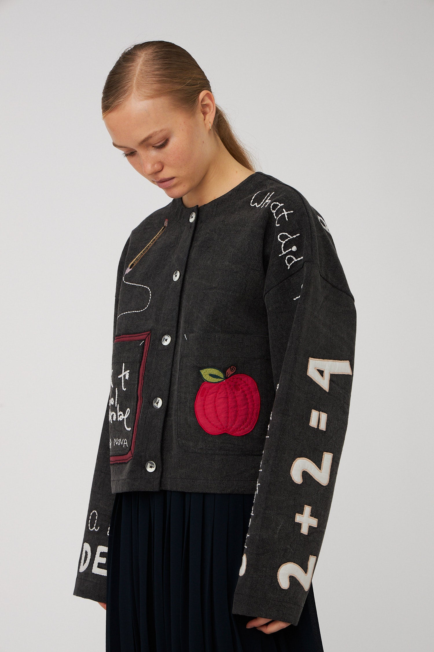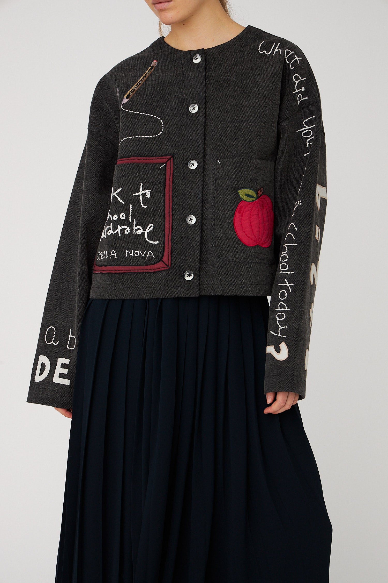 Jacket with embroidered school class-inspired motifs on the front, back, and sleeves. The jacket is closed with buttons and loops in the center front.