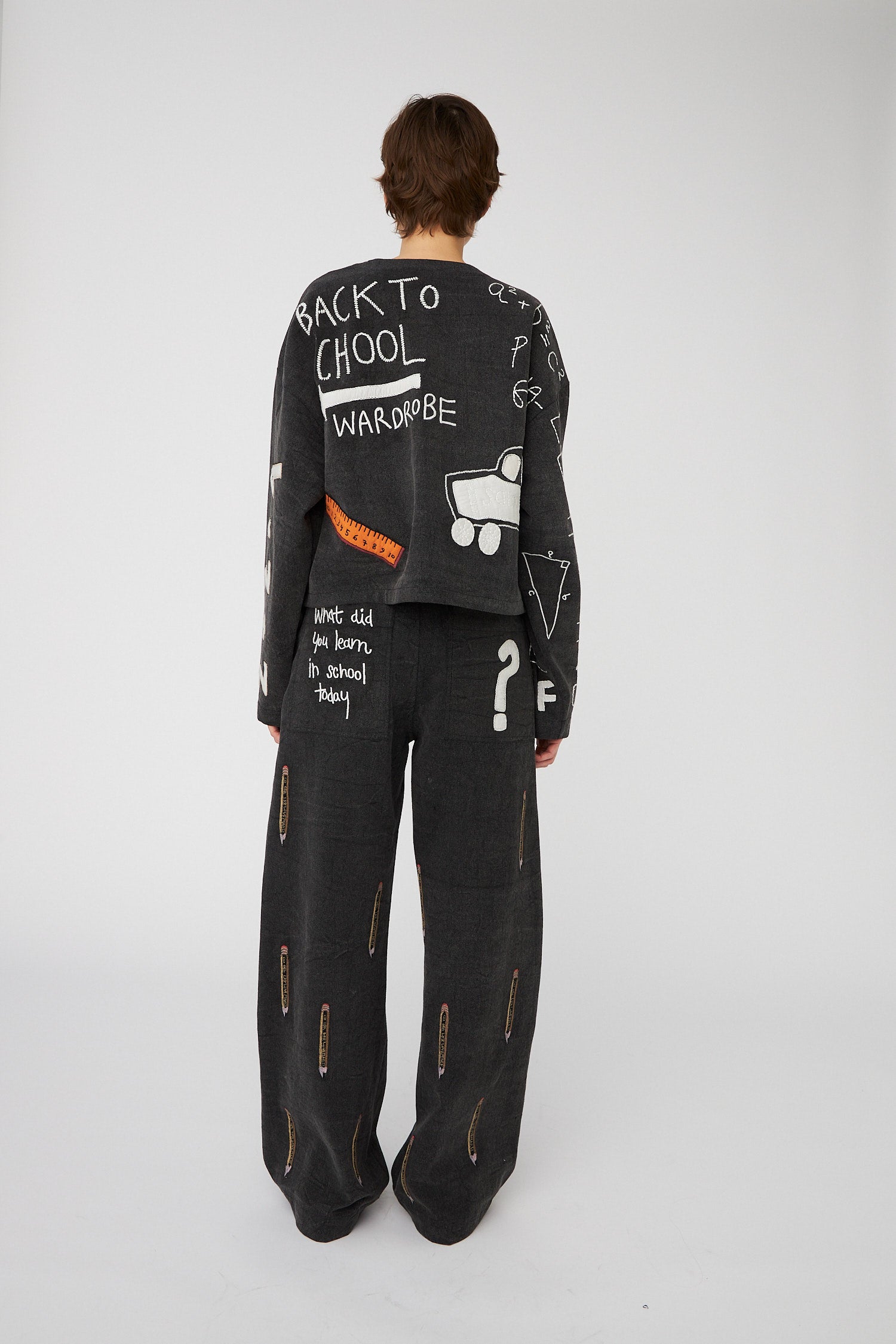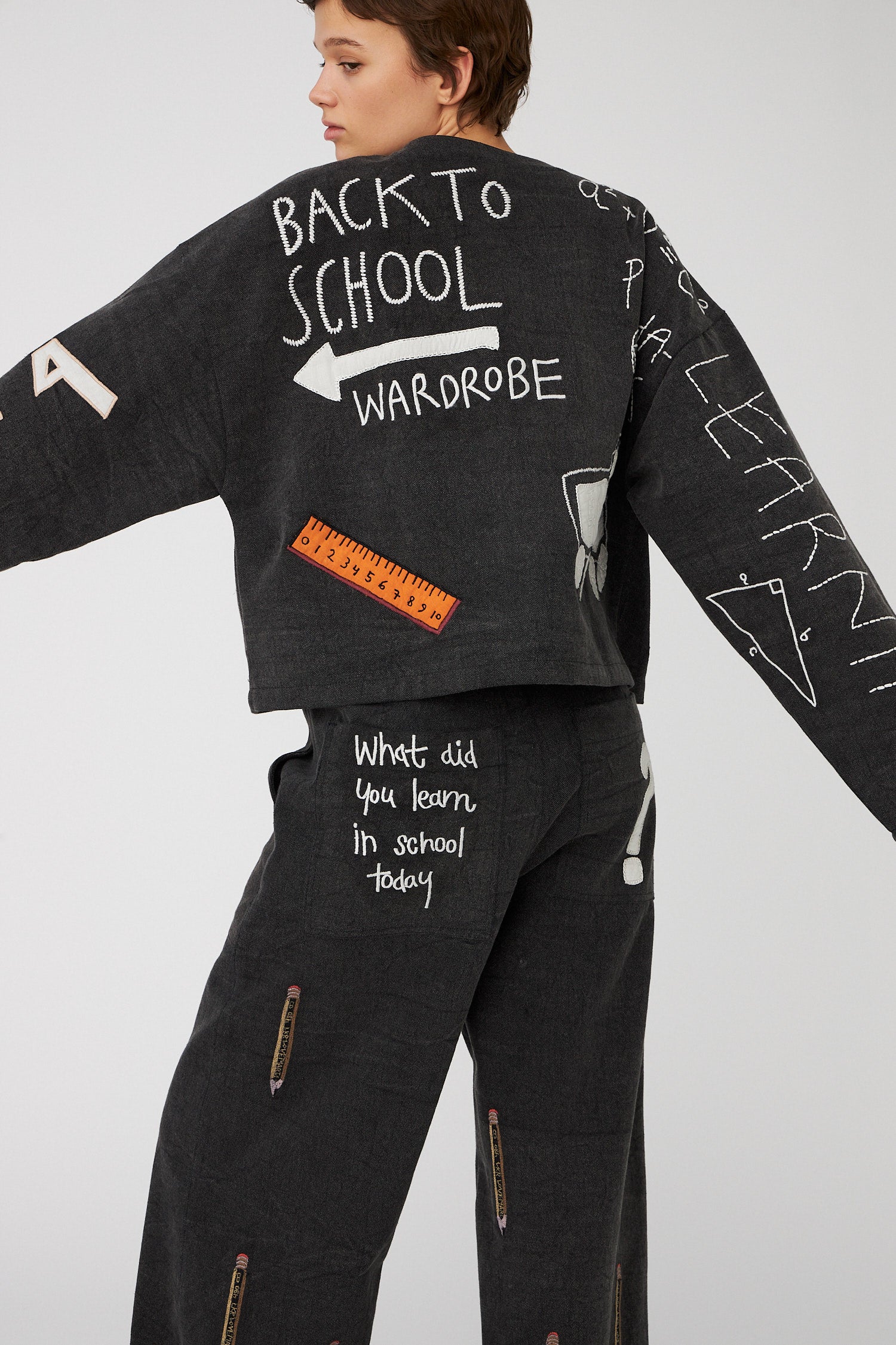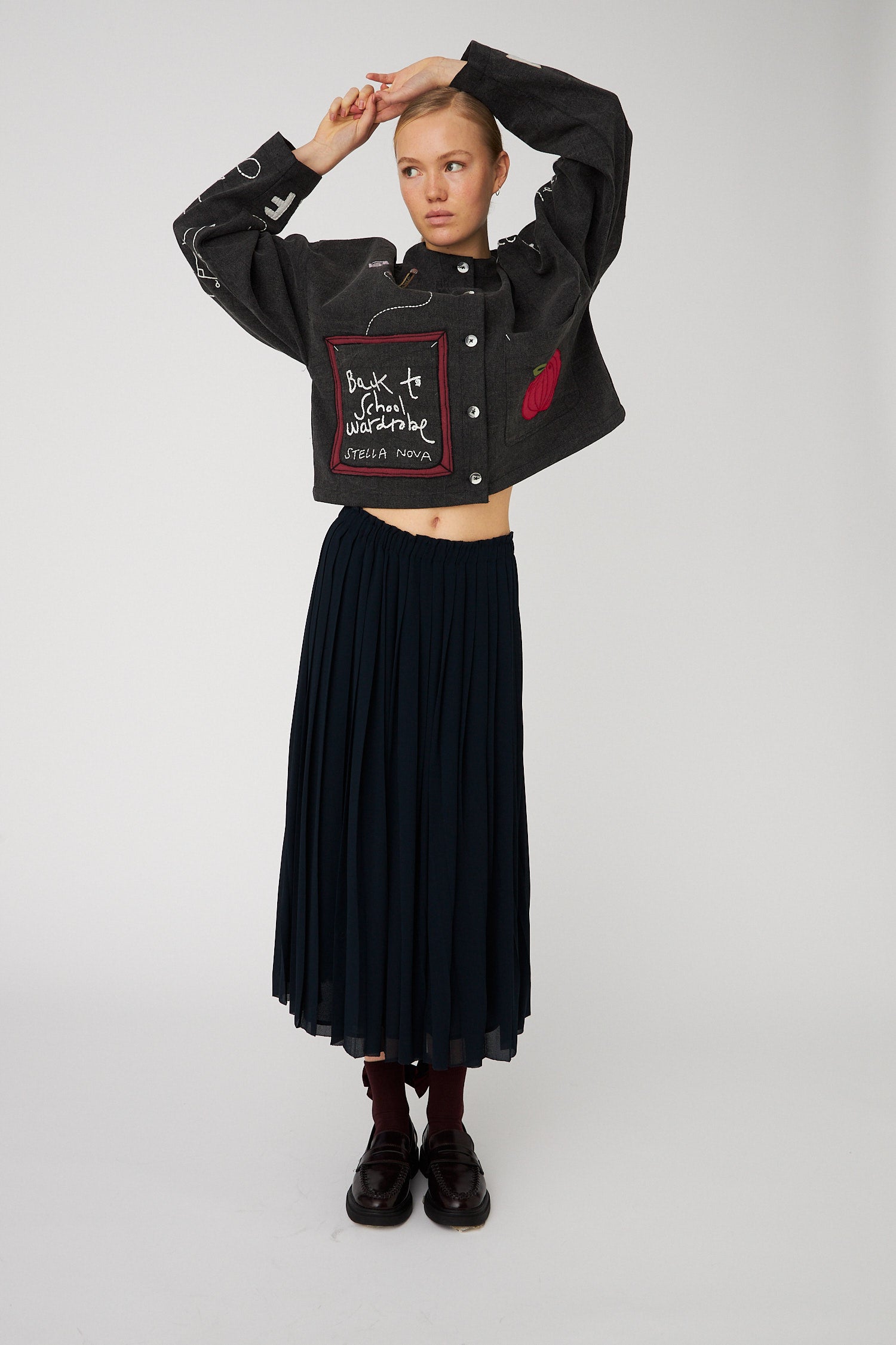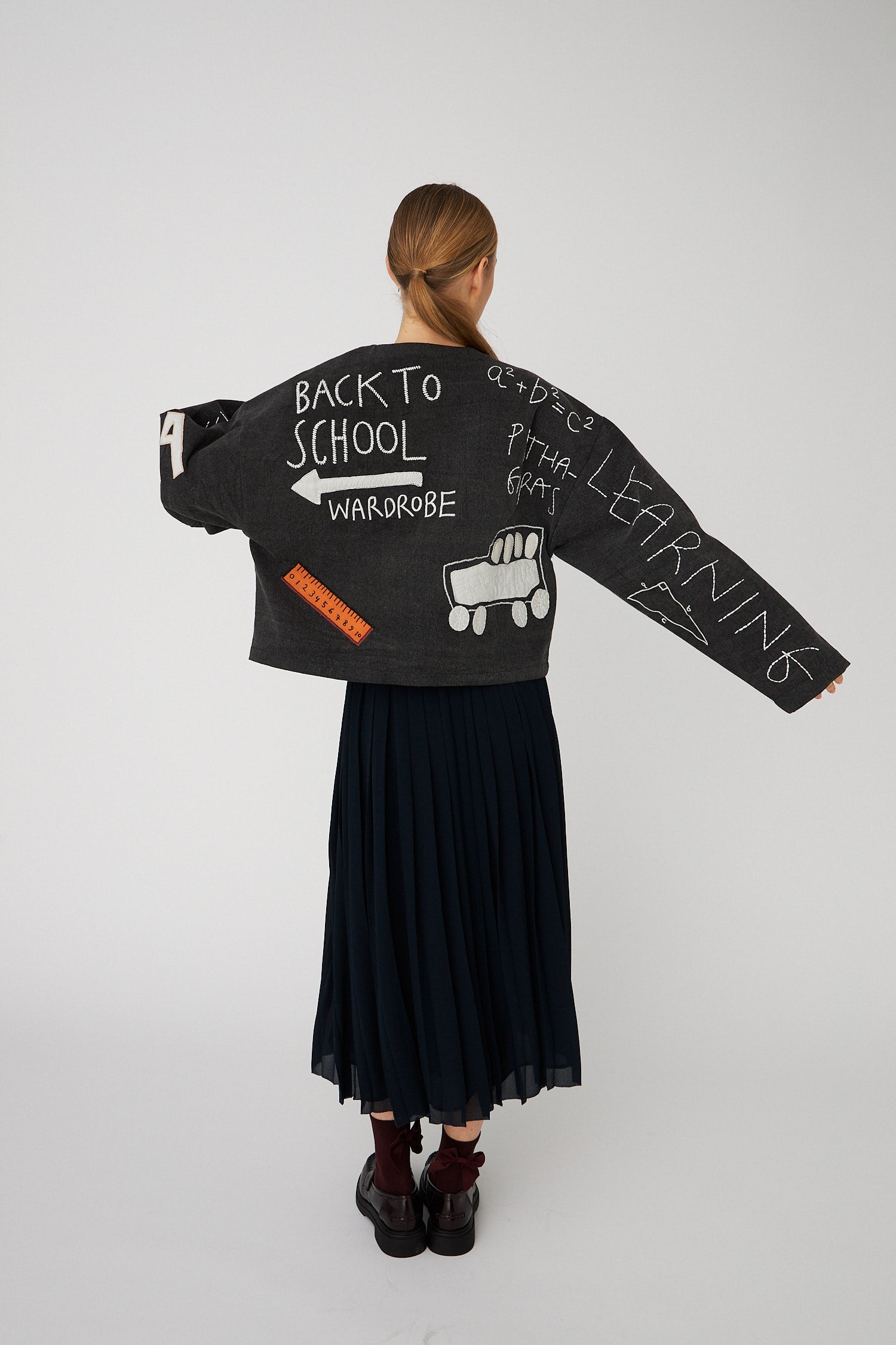 Jacket with embroidered school class-inspired motifs on the front, back, and sleeves. The jacket is closed with buttons and loops in the center front.