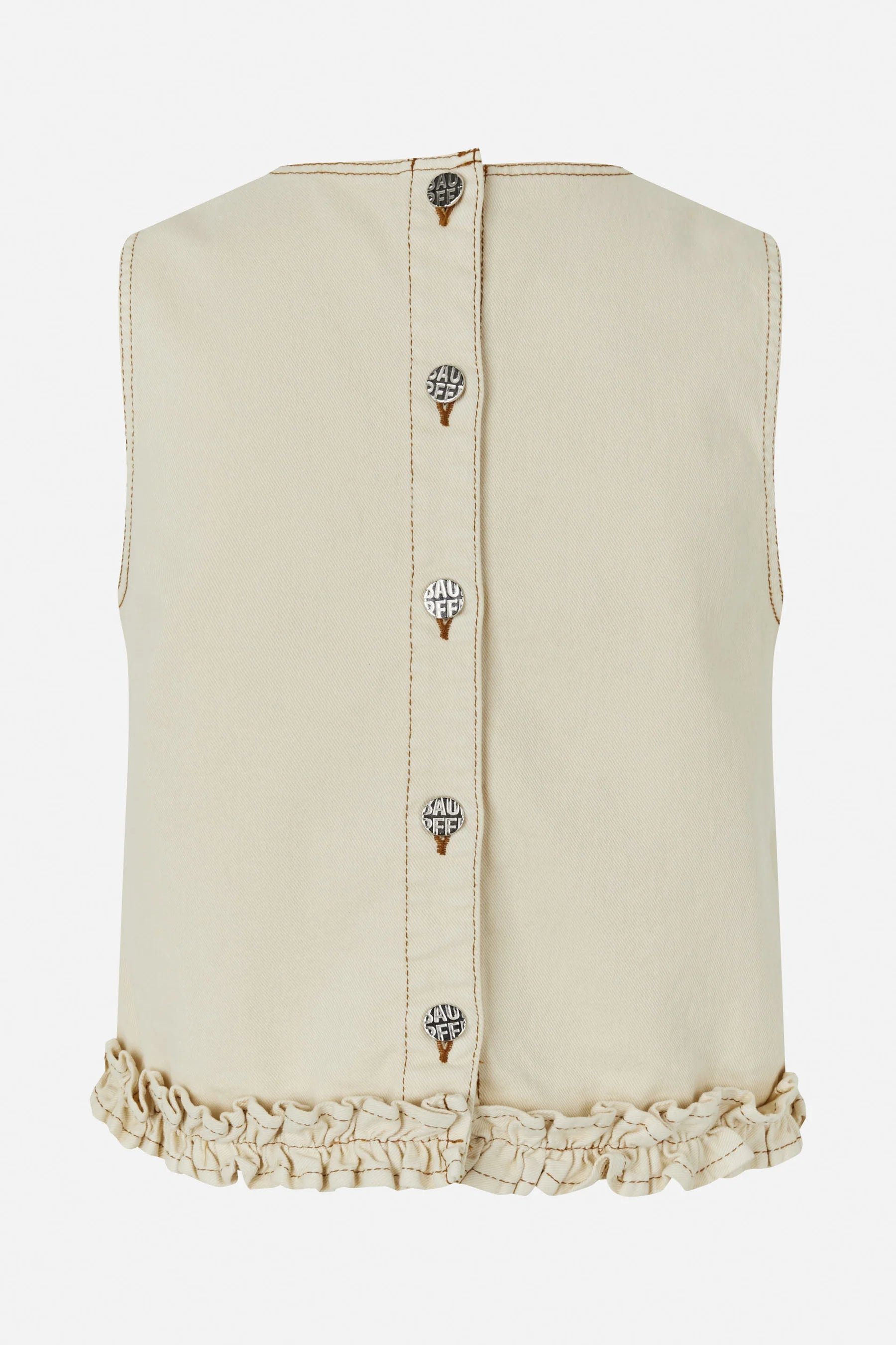 BAUM UND PFERDGARTEN Madie - Afterglow. The Madie Top is a sleeveless denim top, made in organic cotton twill. It has a cropped and relaxed fit and frills at the hemline.