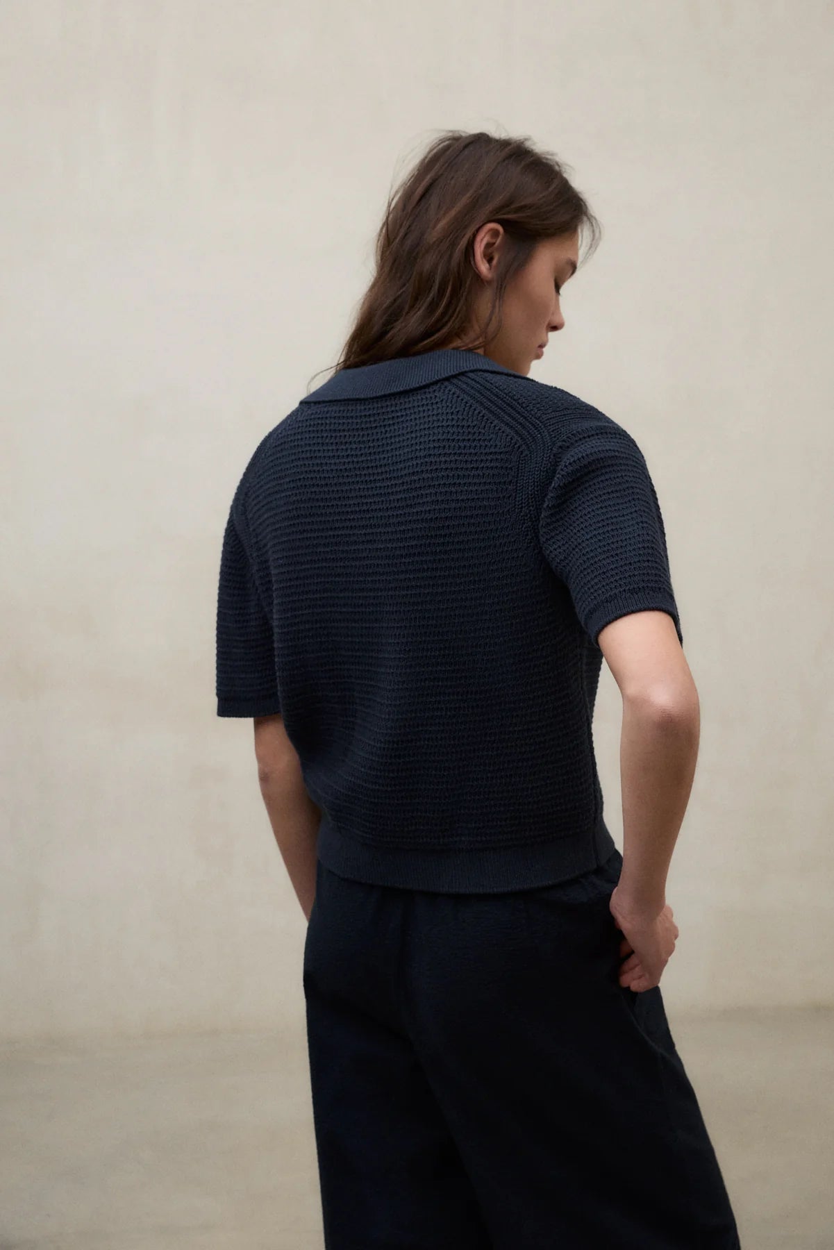 The Anna Sweater is made of 55% organic cotton. Relaxed fit. Ruffled collar, hem and cuffs, and dropped shoulders.
