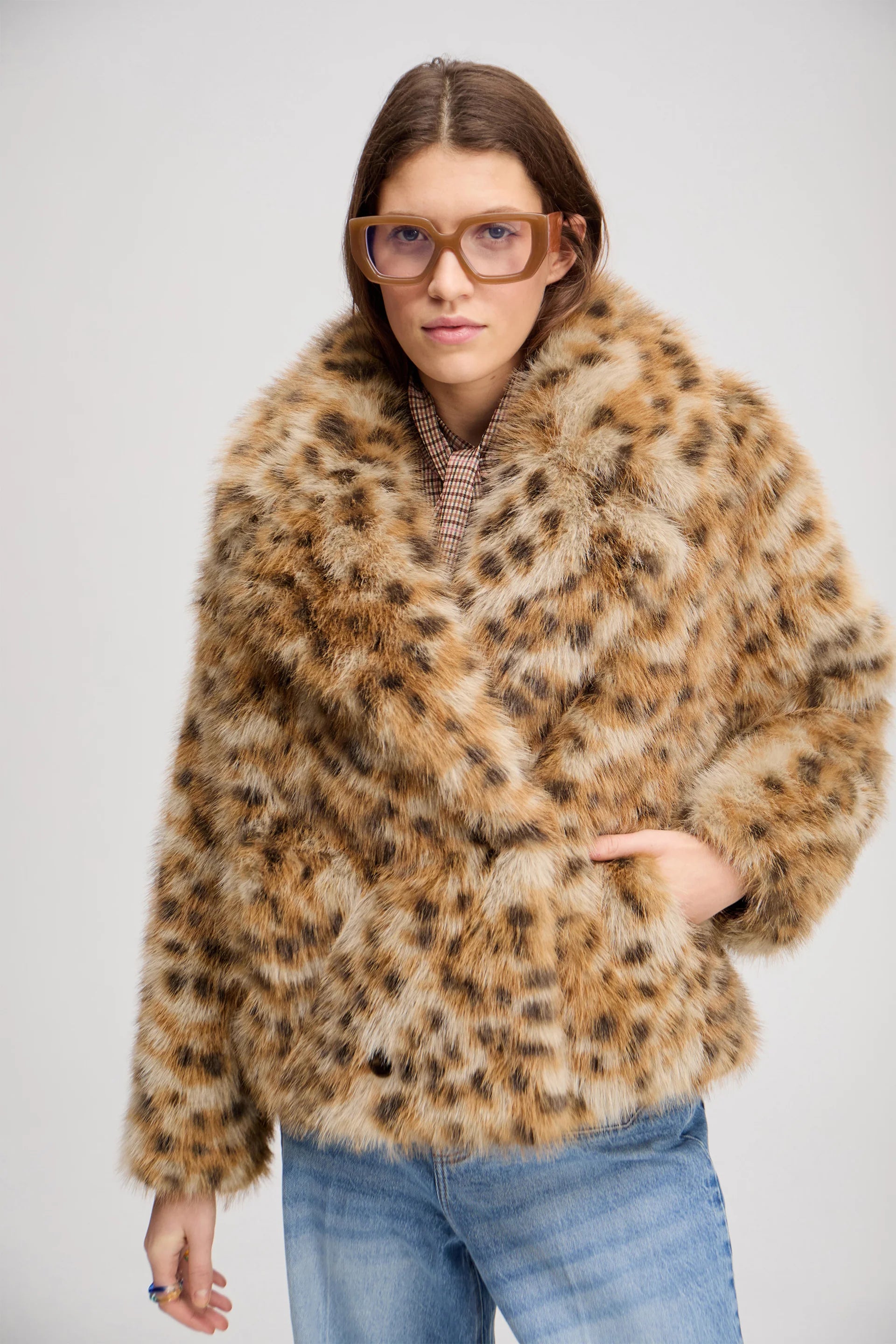 A beautiful, short faux fur jacket with double-breasted button fastening and an elegant wide collar. The jacket is designed with side pockets.