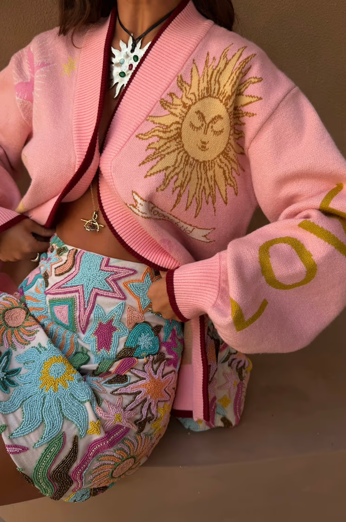Never Fully Dressed -Pink Mystical Cardigan. A light throw over for when it gets chilly in the evenings, with the thicker ribbed hems giving a slightly bomber-esque silhouette. In a soft touch knit base with contrast burgundy trims and beautiful jacquard motifs, inspired by the accents of gold and silver accompanied by engravings of suns and moons that can be found throughout the souks of Marrakech.
