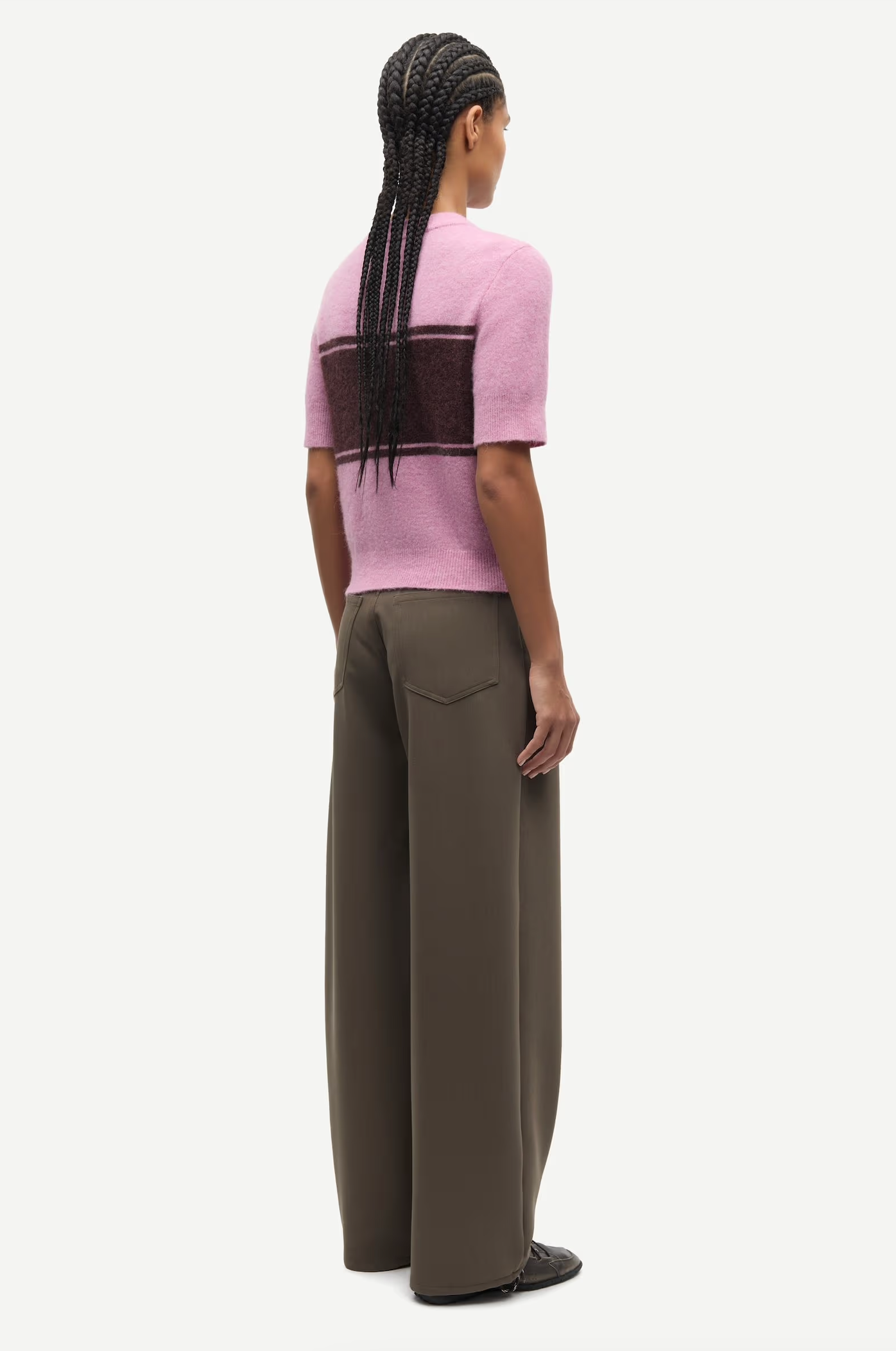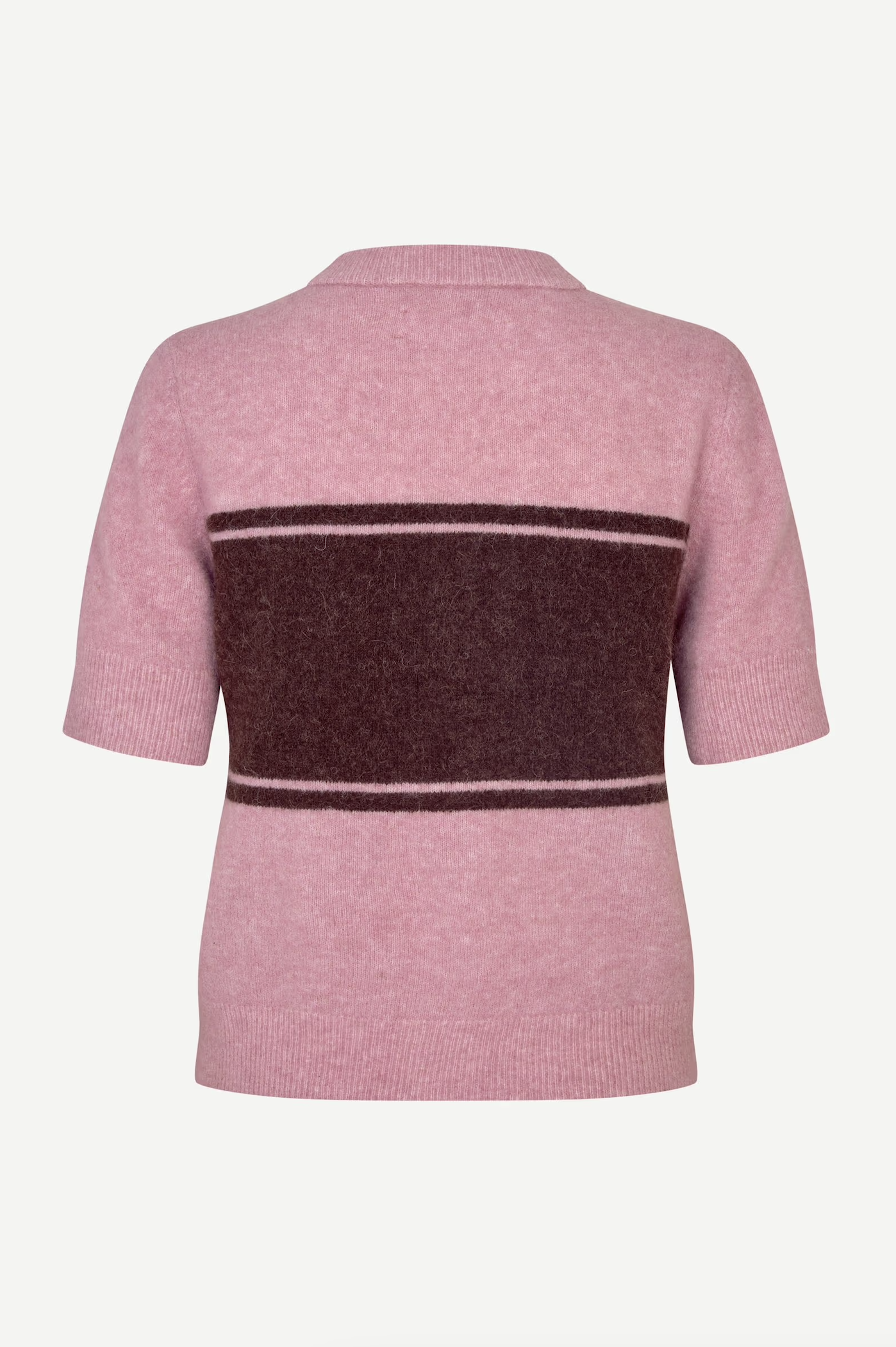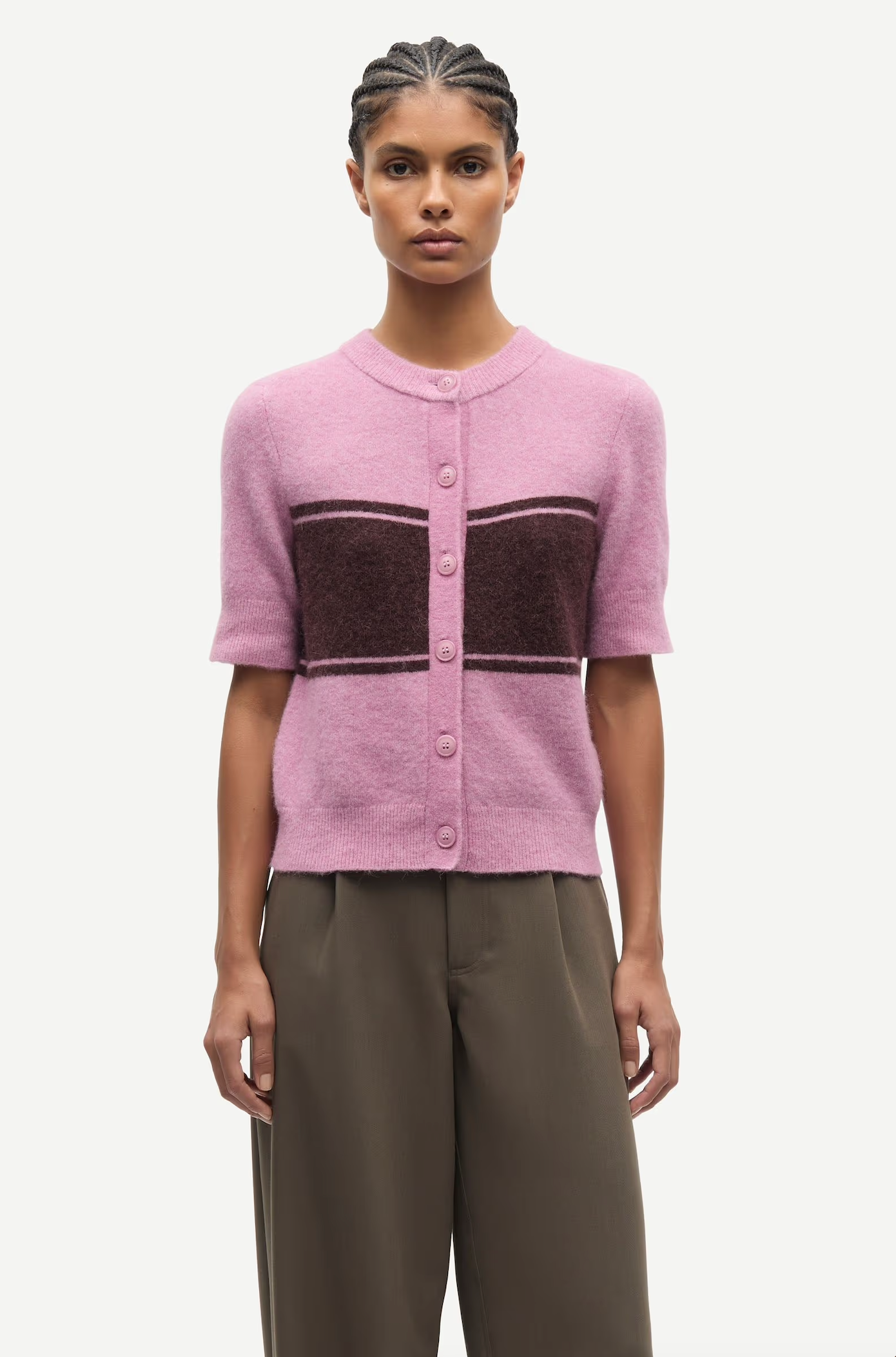 SAMSØE SAMSØE Sanoura SS Cardigan - Orchid Wide St. Short-sleeved cardigan with a regular fit. Button closure on the front. Rib-knitted collar, cuffs, and hem. Round neck. Main material made from an elastic blend of wool, alpaca wool, and recycled polyester.