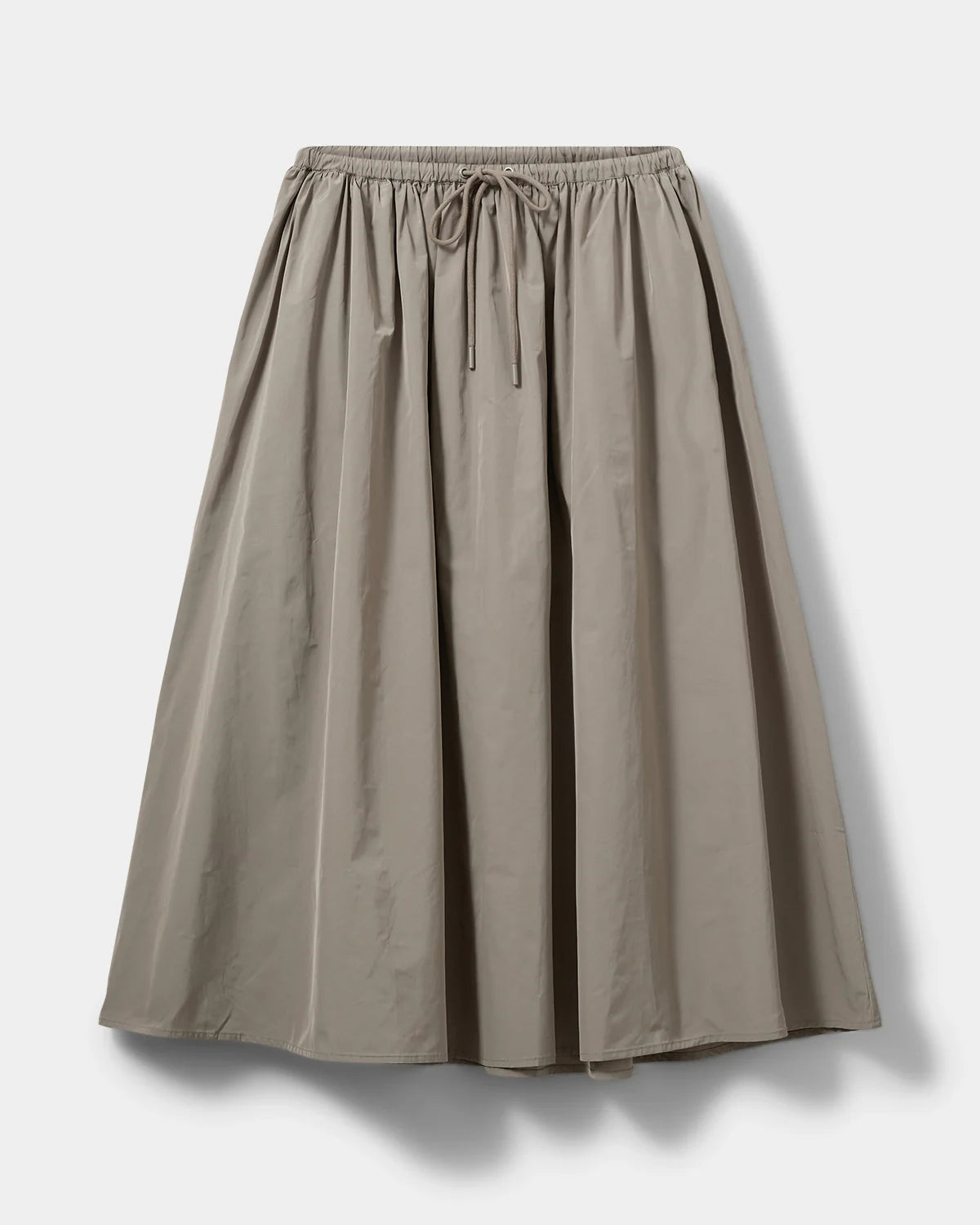 Dusty Green, Midi Skirt. A great A-line shape skirt with an elastic waistband and adjustable drawstring. This style includes side pockets.