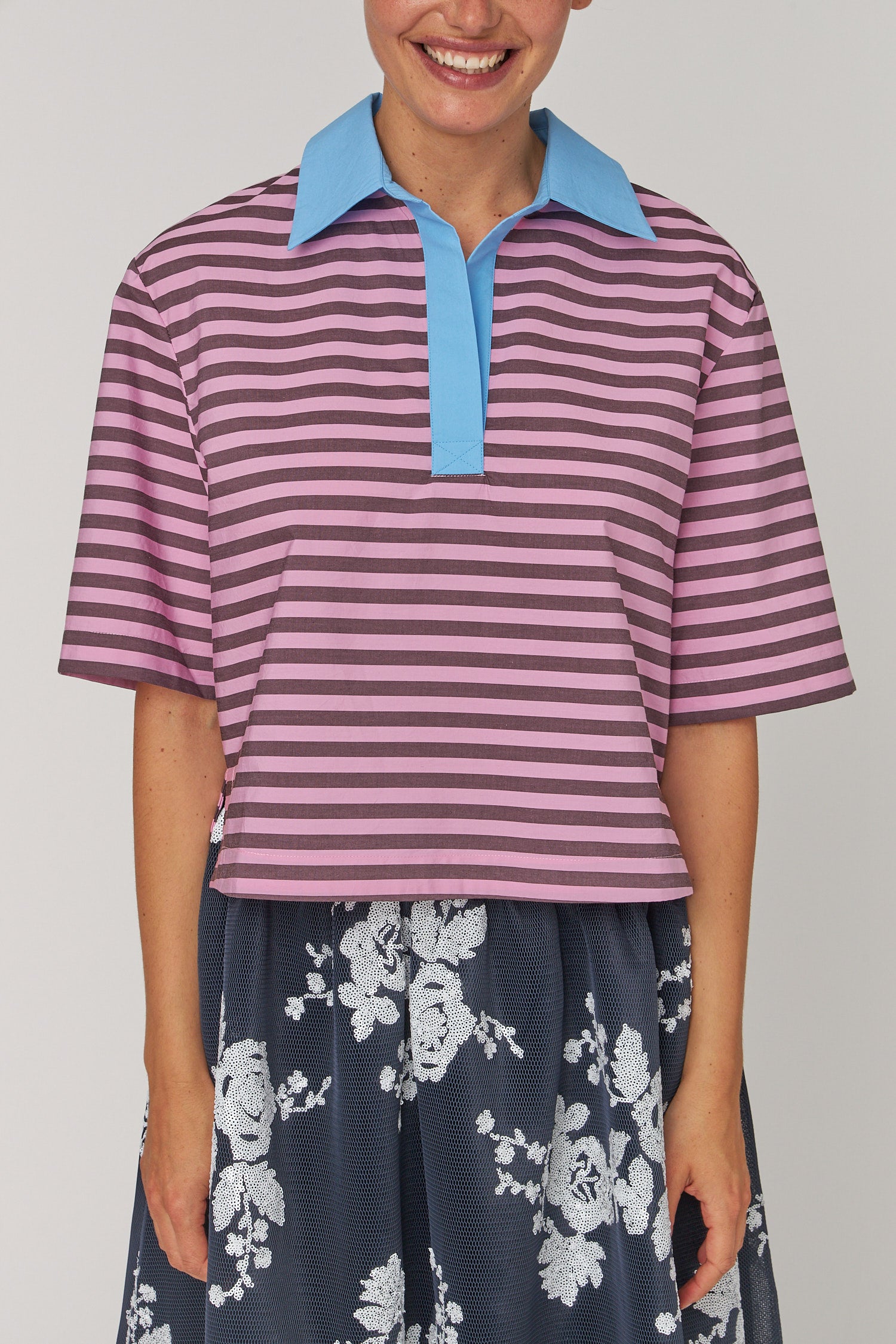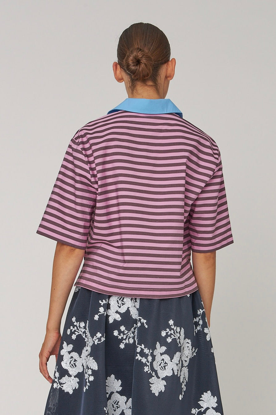 STELLA NOVA Striped Cotton Shirt. Striped cotton shirt with a relaxed fit and cropped length. It features short sleeves and a contrasting collar with a placket.