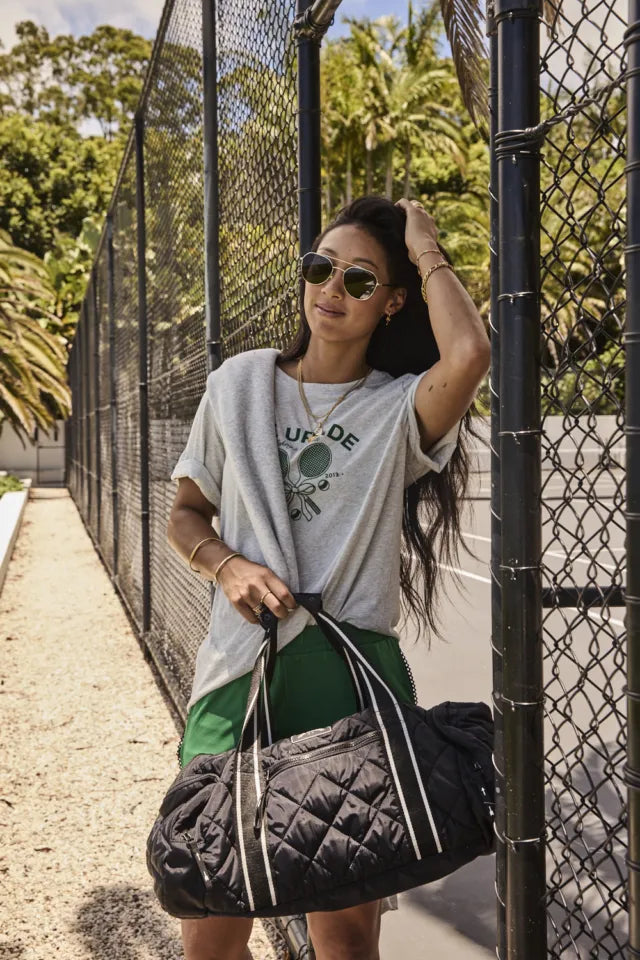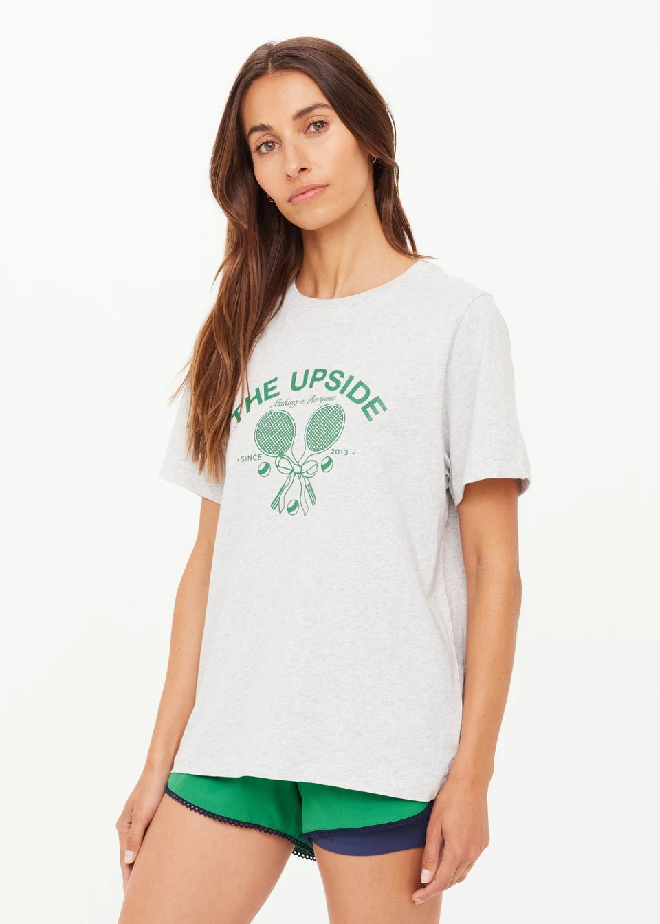 THE UPSIDE - RACQUET CASEY TEE. A grey marle tee with a little racquet sport energy